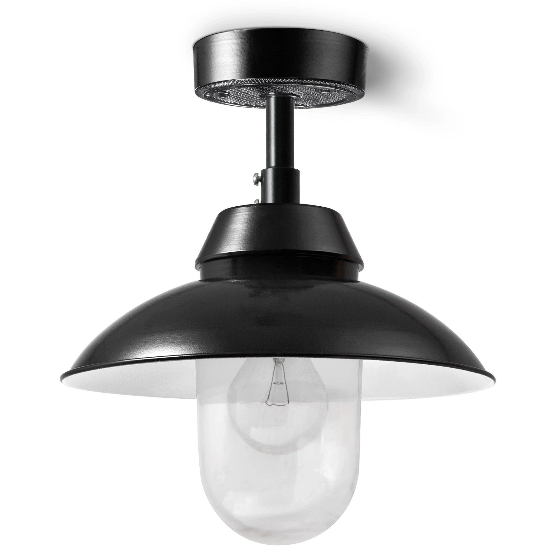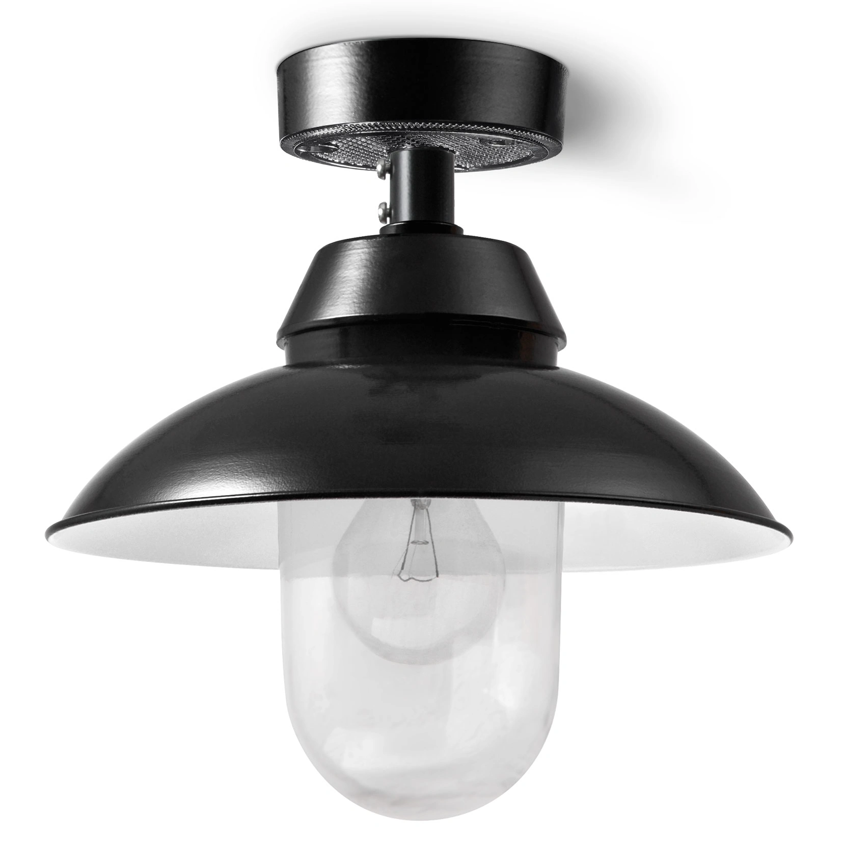 A simple luminaire with a curved shade and screw-in glass in the shape of a cylinder as a ceiling light. Made of traditionally manufactured cast and pressed parts and individual porcelain elements. Especially in the deep black version, it impresses with its clarity of form and color.